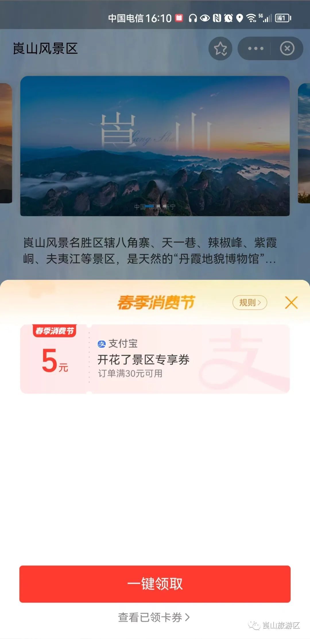 2023年4月26至5月3日,游客通过支付宝平台进入“崀山景区”小程序购买景区门票可获赠满30元立减5元的优惠券,活动期间每个支付宝用户每天仅限使用1次。(总优惠金额预计10万元,先购先得,不予返现)