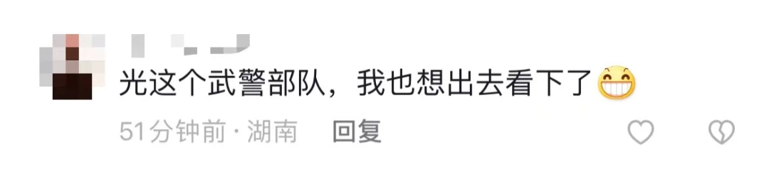 他们的英姿飒爽和专业的操作,让不少市民游客纷纷点赞。有网友在线表白长沙,“长沙一座有温暖的城市、有人间烟火气息的城市!大爱!”“又添一道靓丽的风景线。”有网友向武警、民警致敬“你们辛苦啦!”还有网友表示收获了满满的安全感,“光是武警部队,也想出去看下了。”