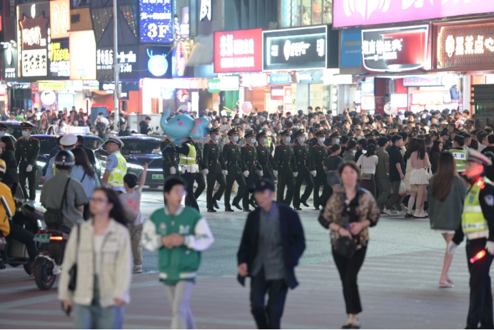 4月30日晚,长沙市中心解放西路人山人海,开启假日“人从众”模式。武警湖南总队长沙支队官兵同长沙民警一起迈着整齐的步伐,组成拉链式人墙,引导游客有序过斑马线。一道道筑墙,保障游客安全。