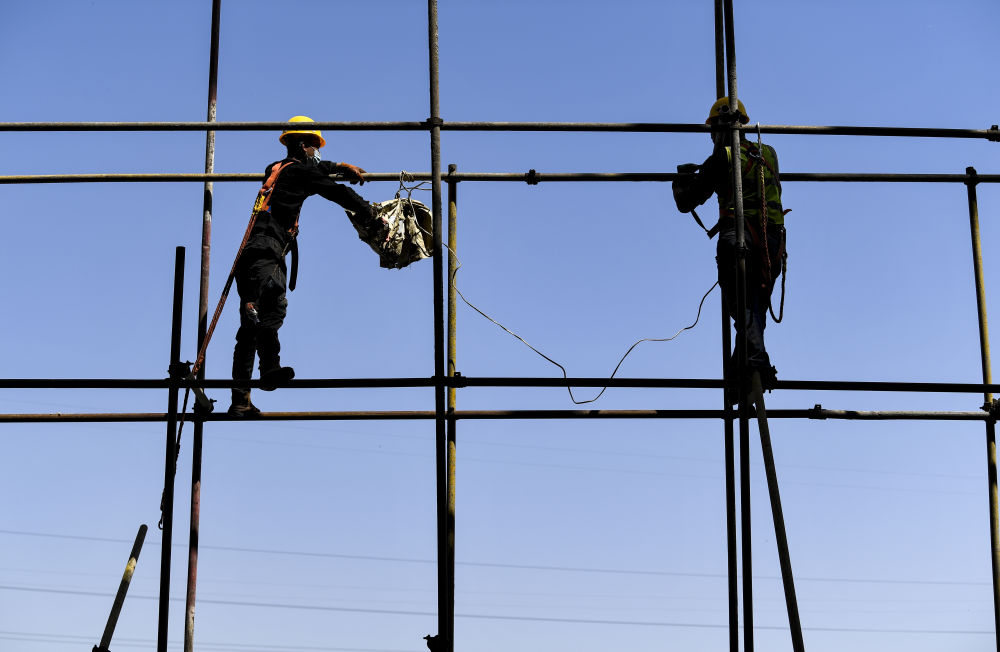 在湖北省武汉市一处建筑工地,工人在进行高空作业(2021年11月15日摄)。新华社记者 肖艺九 摄