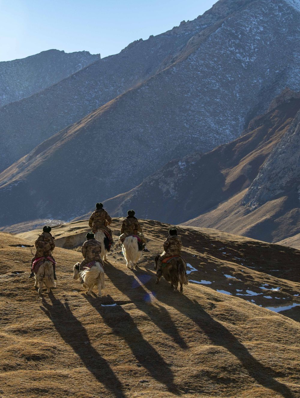 在昆仑山腹地,新疆生产建设兵团第三师图木舒克市叶城二牧场三连职工骑着牦牛行进在巡边路上(2020年12月25日摄)。新华社记者 胡虎虎 摄