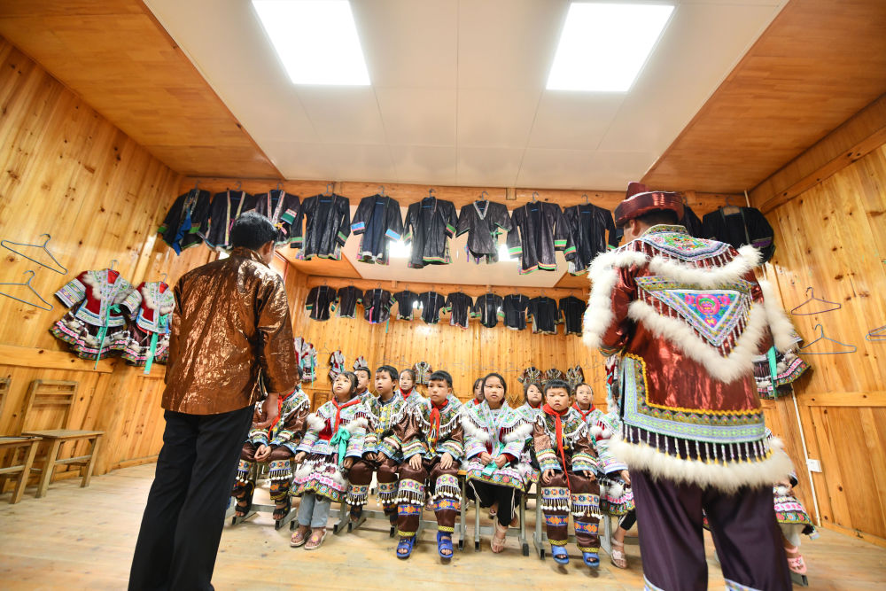 在广西融水苗族自治县杆洞乡乌英苗寨教学点,老师潘先锋(前右)、蒙林安(前左)给孩子们上民族文化课(2022年5月31日摄)。新华社记者 黄孝邦 摄