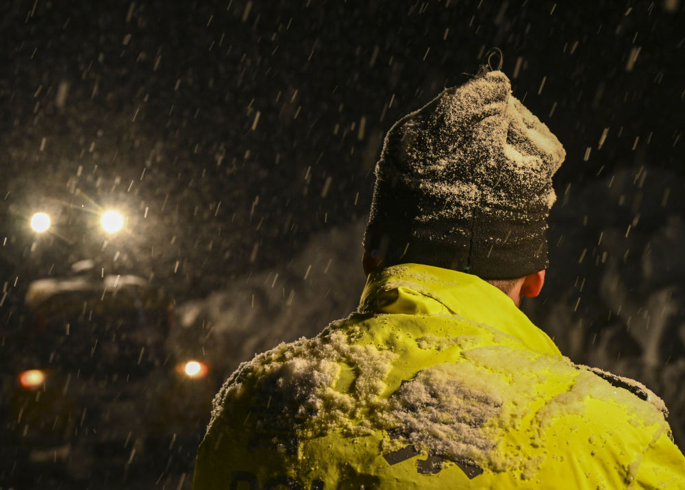 新疆喀纳斯景区公安局交警大队民警马国军在一处山路雪崩救援现场工作(2023年1月8日摄)。新华社记者 胡虎虎 摄