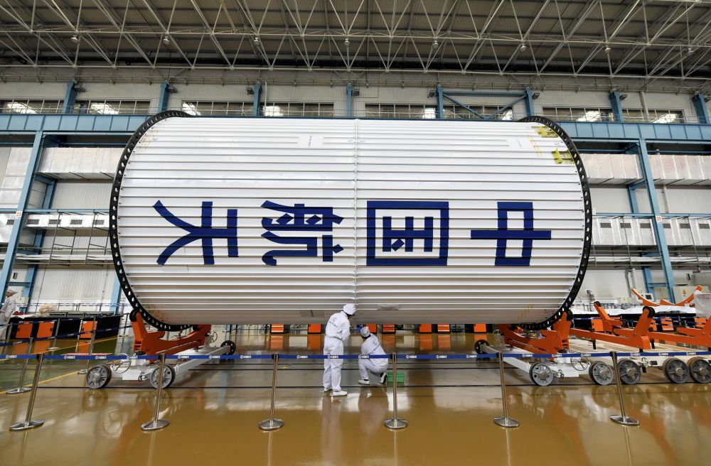 在航天科技集团一院天津火箭公司总装测试车间,装配一组班组成员在进行火箭装配(2023年4月19日摄)。新华社记者 孙凡越 摄
