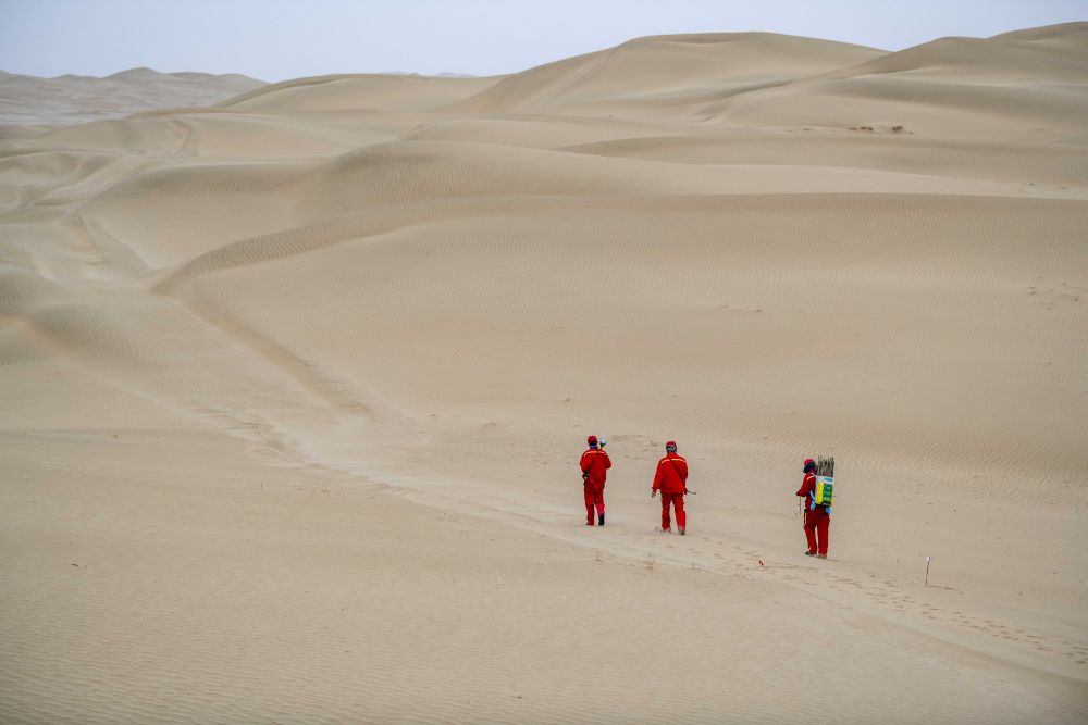 东方地球物理公司新疆塔里木物探处的工人冯永生(前)、冯双生(中)、冯志鹏在沙漠中进行测量定位,标记钻井点(2021年2月25日摄)。新华社记者 胡虎虎 摄
