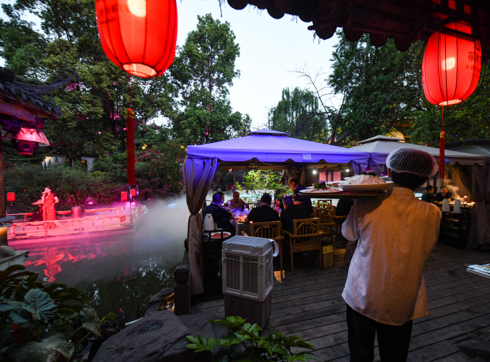 在四川省成都市一家火锅店内,24岁的传菜员姚帅在给顾客上菜(2023年4月25日摄)。新华社记者 王曦 摄