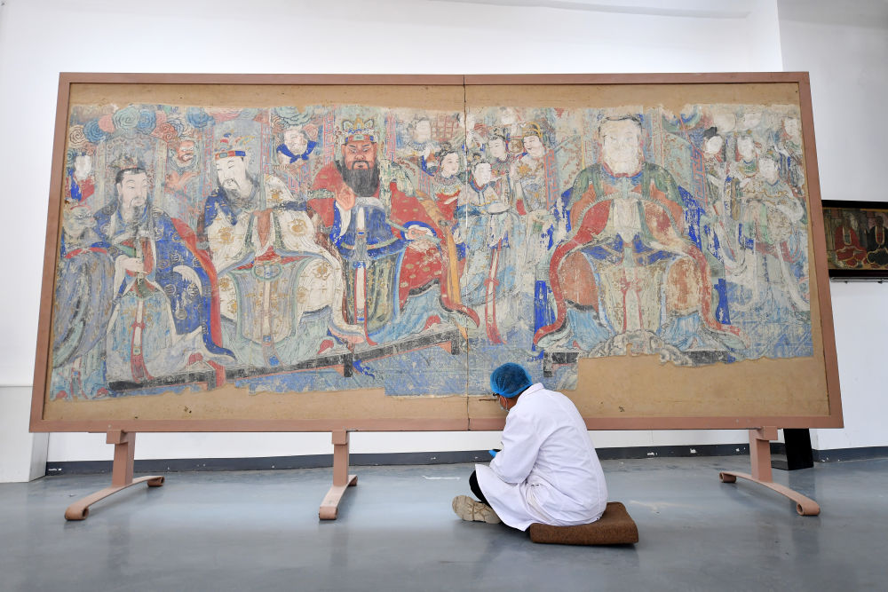 在山西省大同市云冈石窟研究院壁画文物修复室,工作人员在修复壁画(2021年5月9日摄)。新华社记者 詹彦 摄