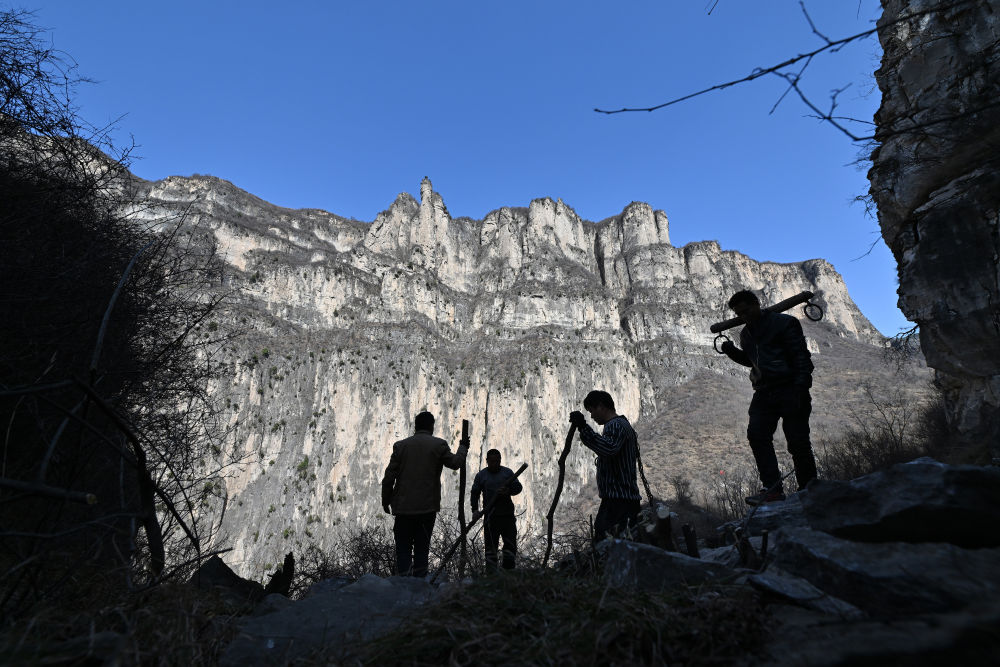 在山西省壶关县大峡谷镇青龙峡村,村民们在山上修路(2023年3月7日摄)。新华社记者 詹彦 摄