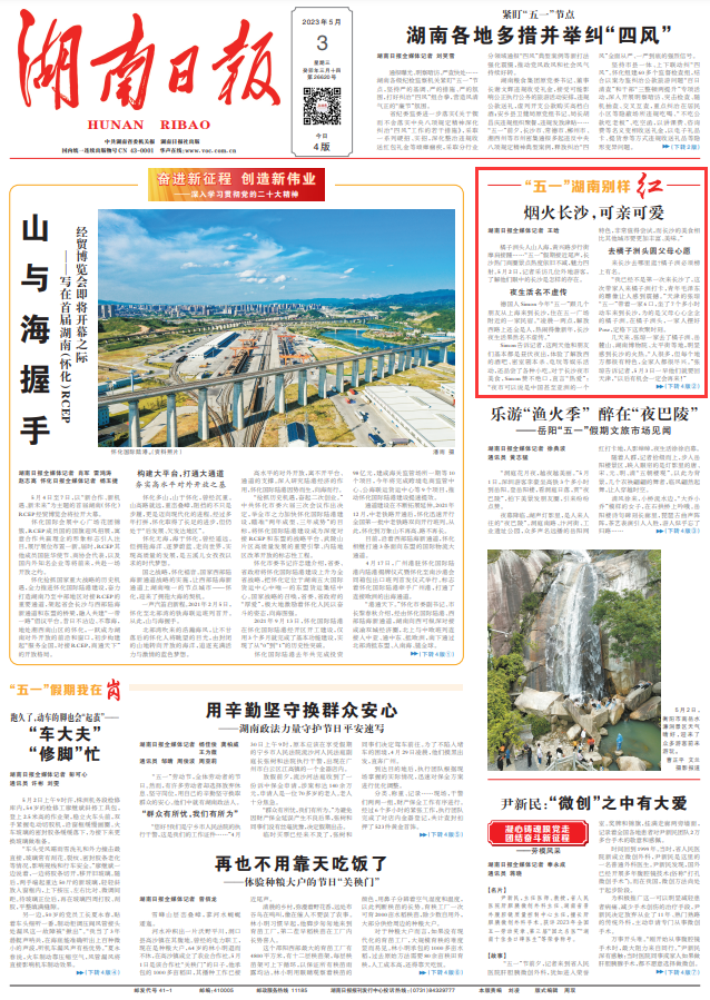 几天来,张琼一家去了橘子洲、岳麓山、省博物馆、太平街等地,明显感觉长沙的火热。“人很多,但每个地方都很有特色,全家人都很尽兴。”张琼告诉记者,5月3日一早他们就要回天津,“以后有机会一定会再来!”