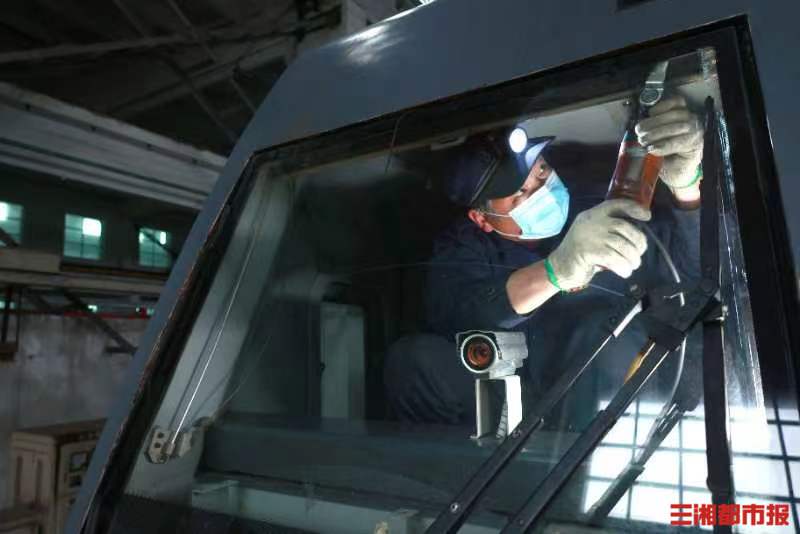 5月2日9时,株洲机务段检修库内,54岁的廖继斌斜跨工具包,登上近2.5米高的作业架,稳立在火车头前,双手紧握电动切胶机,沿窗框缓慢画圈,为火车头前挡玻璃切胶条,为接下来更换玻璃做准备。
