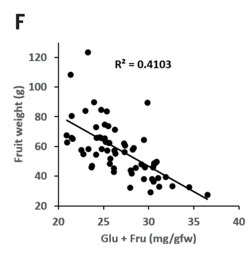 西红柿里果糖葡萄糖比重和果实大小的关系。图片来源:参考文献[6]
