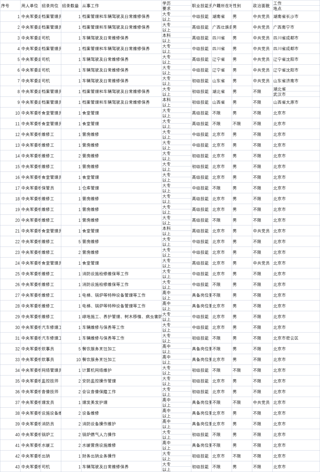 主要是中央军委后勤保障部某单位档案管理员兼司机、司机,中央军委机关事务管理总局某单位食堂管理员、维修工、保管员、汽车修理工、炊事员、网络管理员、监控技师、音像技师、理发员、设施设备维护员、消防员、锅炉工、水暖工、出纳、司机等专业技能类岗位。