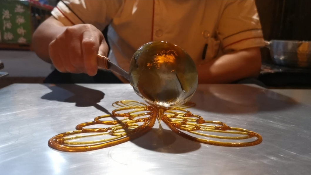 糖画师傅约摸三十多岁,外地人,白面无须,面容清俊,含着笑,请我转盘。我一转,一只“蝴蝶”。只见糖画师傅用尺子轻轻地刮着工作台面,右手舀起一瓢糖,略一倾斜,糖汁就流了下来;他飞快地舞着瓢,左左右右,上上下下,很快摹画出“蝴蝶”的雏形。他又适时收汁,细细描摩“蝴蝶”背上的筋骨,左右比划,很快地,一只用糖画成的“蝴蝶”就匐伏在案板上了。接着,他拿一根细长的竹棍儿,粘上去,左压压,右压压,再一撮,拎起棍头儿递给我。