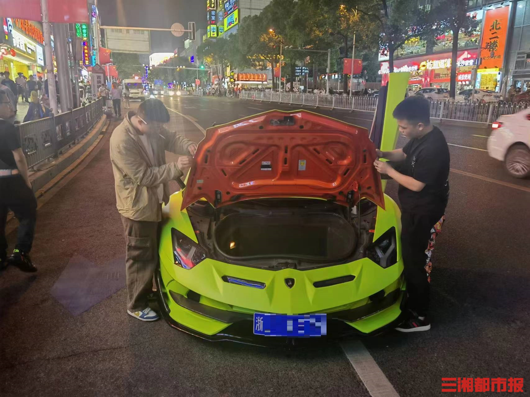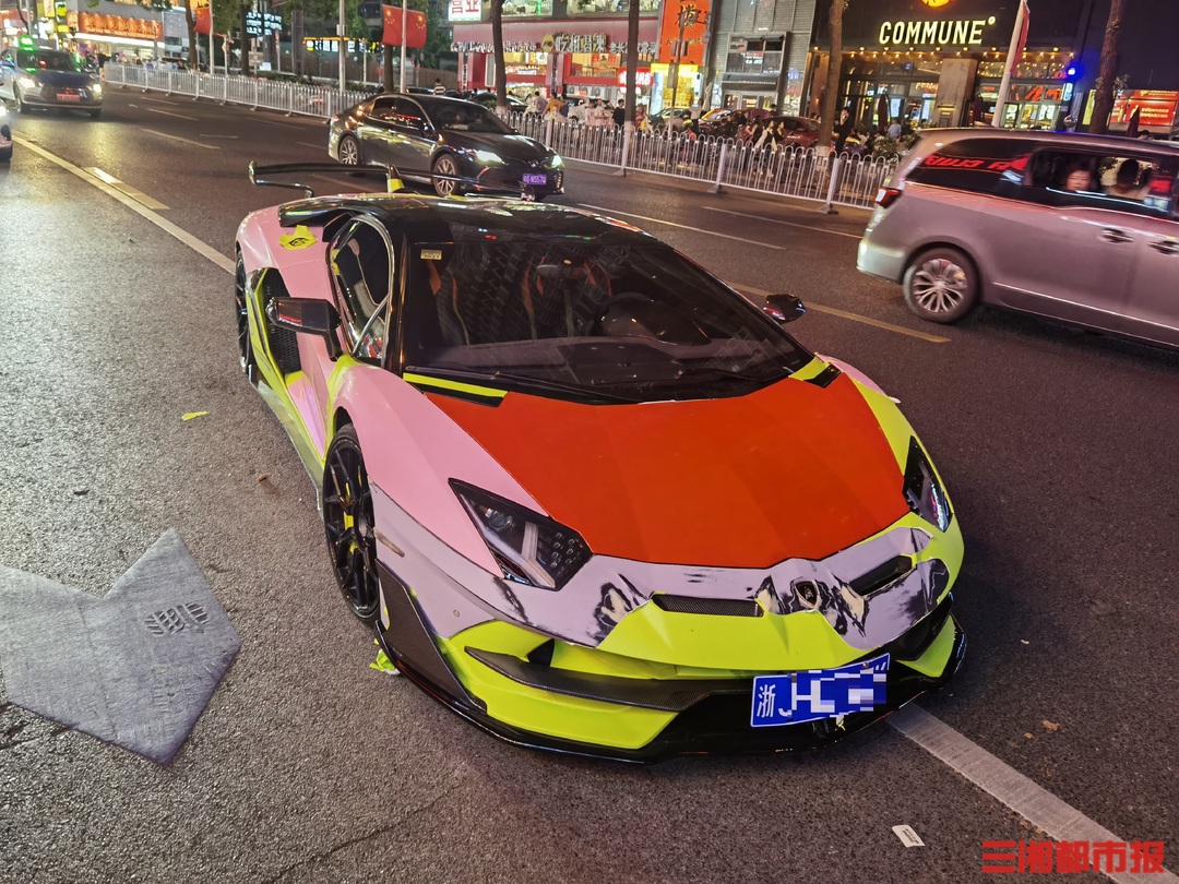 3日晚,长沙交警天心大队铁骑中队民警正在五一商圈周边开展夜间巡逻。21时50分,解放西路出现数辆超跑,铁骑中队中队长龙玺宇立即示意车辆靠边,提醒驾驶人遵守交规,勿产生噪声扰民。在对其中一台车牌为浙J1X**K的兰博基尼跑车进行检查时,民警发现该车涉嫌非法改装行为。