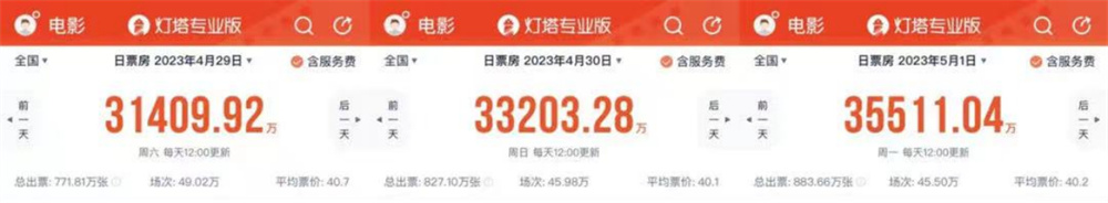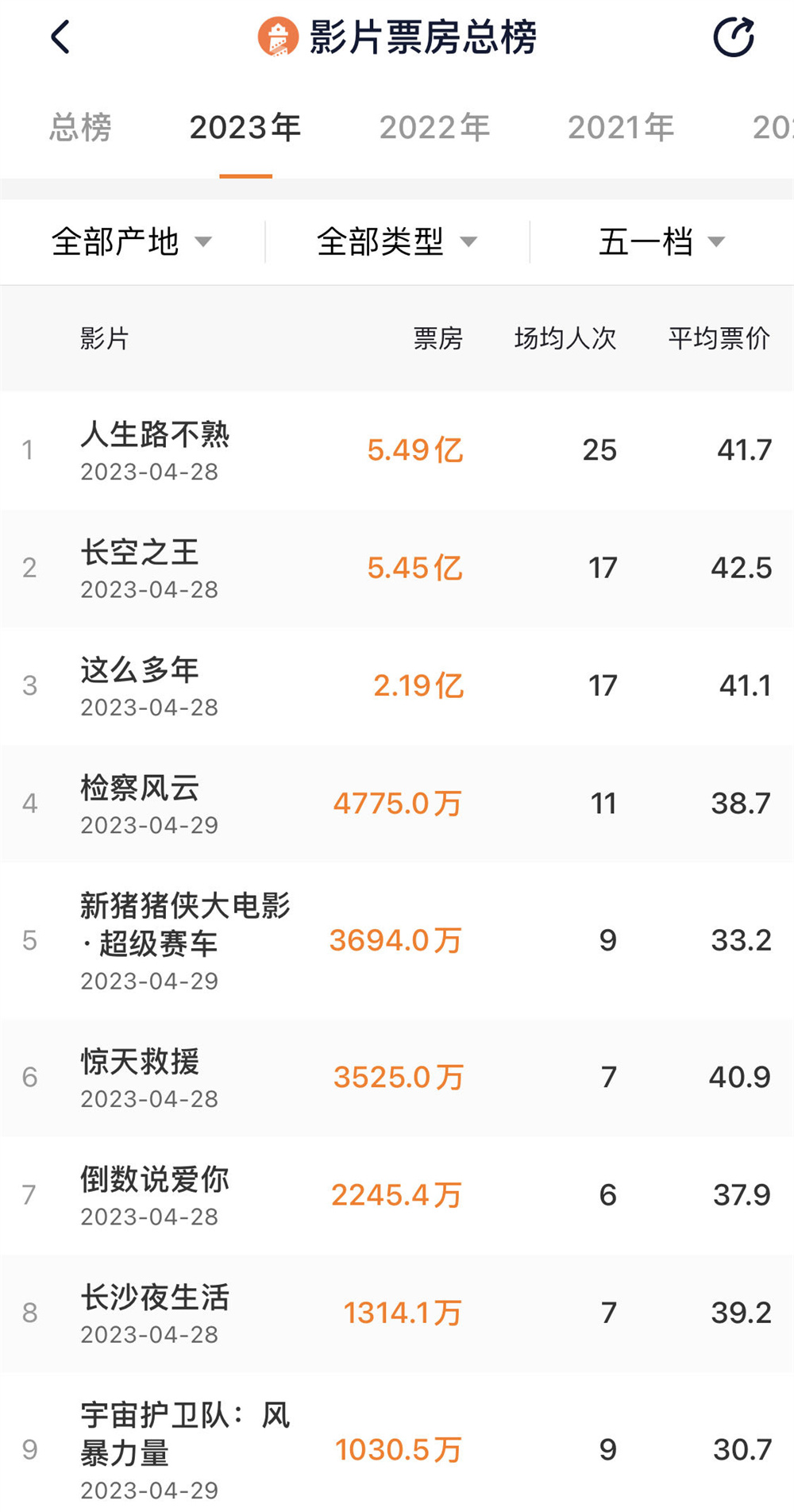 以“史上最高票房五一档”2019年为例,首日的6亿元票房产出后,之后的票房则连日下跌为4.2亿、3.1亿、1.9亿。而2023年的五一档票房,五天之中有四天的单日都在3亿以上。4月30日起,豆瓣电影公布了4部五一档新片的评分,其中《人生路不熟》《长空之王》《这么多年》《长沙夜生活》在开分时分别获得7.0分、7.0分、6.9分和7.6分,平稳和正向的口碑也为电影大盘稳住了观众的观影热情。