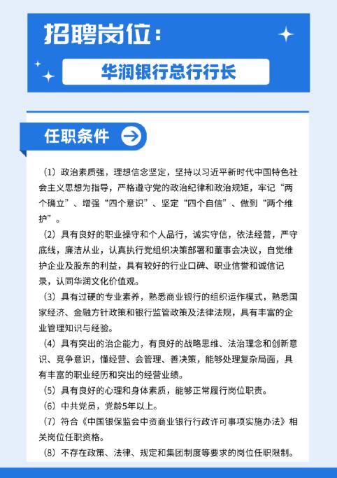 首先来看此次珠海华润银行招聘总行行长的具体条件: