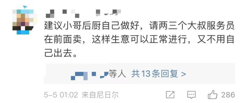 有网友给小哥提建议:“自己做后厨,雇服务人员”,“可以转行卖烧烤”。