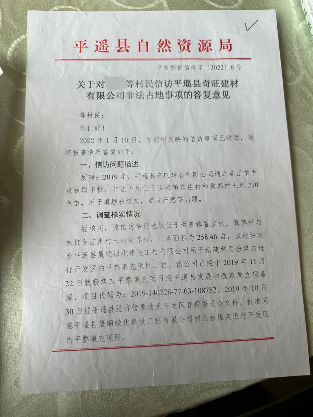 那么这个填埋场所使用的土地性质究竟是什么?对此,平遥县自然资源局在2022年1月25日给村民的信访答复意见中称,该项目占地258.46亩,为平遥县晟顺绿化建设工程有限公司用于新建利用粉煤灰进行开发区内平整填充项目工程,已于2019年11月22日经平遥县发展和改革局立项备案。
