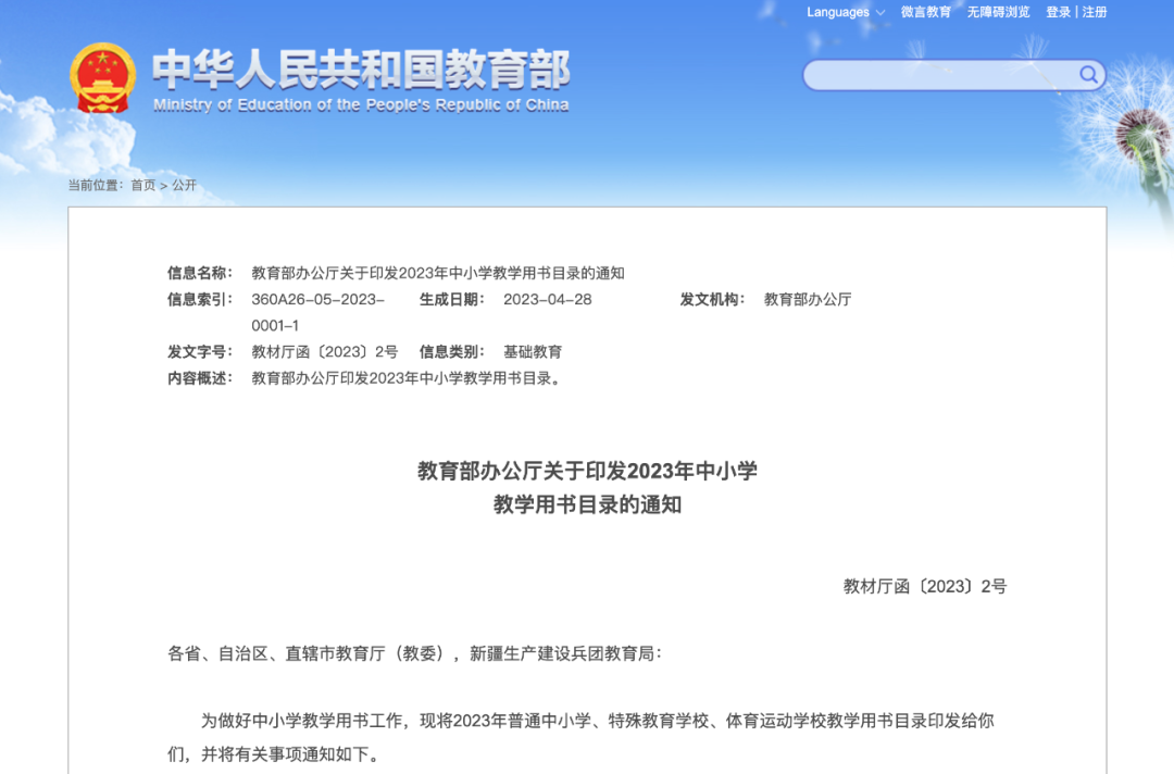 为做好中小学教学用书工作,现将2023年普通中小学、特殊教育学校、体育运动学校教学用书目录印发给你们,并将有关事项通知如下。1.义务教育国家课程各学科使用《2023年义务教育国家课程教学用书目录》中的教材。2.属于义务教育国家课程但目录中没有相关教材,由各省级教育行政部门根据义务教育国家课程方案、课程标准和《中小学教材管理办法》确定相关课程实施方式和教学材料,如需使用教材,所用教材须正式出版并经省级教育部门审定并列入省级中小学教学用书目录。1.《2023年普通高中国家课程教学用书目录(根据2017年版课程标准修订)》和《2023年普通高中国家课程教学用书目录(根据2003年课程标准编写)》仍将并行。请各地根据新课程新教材实施方案,按照《国务院办公厅关于新时代推进普通高中育人方式改革的指导意见》(国办发〔2019〕29号)精神,统筹推进,确保实施新课程、使用新教材。2023年秋季学期起,普通高中依据2003年课标编写的高一、高二册次教材不再列入用书目录。2.使用新教材的普通高中,各学科必修、选择性必修课程使用《2023年普通高中国家课程教学用书目录(根据2017年版课程标准修订)》中的教材。选修课程属于校本课程,由各省份按照《中小学教材管理办法》有关规定以及普通高中课程方案、课程标准要求确定教学材料的使用。1.特殊教育学校义务教育阶段相关学科使用《2023年特殊教育学校国家课程教学用书目录》中的教材。没有新编教材的学科和年级仍使用原版本教材,或根据教学实际,选择普通学校教材中适合的内容进行教学。2.体育运动学校道德与法治、语文使用国家统编教材,其他学科使用《2023年体育运动学校国家课程教学用书目录》中的教材,或根据教学实际,选择《2023年义务教育国家课程教学用书目录》中的教材。教育部组织编写的中小学民族团结进步教育教材《中华民族大团结(供初中使用)》(戢广南主编,人民出版社出版)已于2021年经国家教材委员会审核通过。各地根据《教育部等四部门关于印发〈深化新时代学校民族团结进步教育指导纲要〉的通知》要求做好教材选用使用工作。1.中小学教材选用使用按照《教育部关于印发〈中小学教材选用管理办法〉的通知》(教材〔2023〕1号)执行。2.中小学教材中不得夹带任何商业广告或教学辅助资料的链接网址、二维码等信息。3.各地可根据本地实际和学生需求购买配套数字音像材料。鼓励教材出版单位采用互联网下载的方式免费提供。免费教科书采购仍按照教材〔2017〕1号文件有关规定执行。请各省级教育行政部门按照本通知要求,抓紧做好2023年中小学教学用书工作。2023年8月31日前通过教材选用备案系统将本省教材选用使用情况报我部(教材局)备案。相关教学用书目录信息可在教育部政府门户网站(www.moe.gov.cn)公开栏“教育部文件”下“信息拥有司局”中,选择“教材局”进行查询下载。