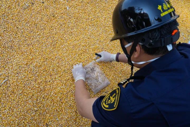▲5月4日,海关检验检疫工作人员在广东麻涌港对首船进口南非饲料玉米进行筛样检查。(新华社)