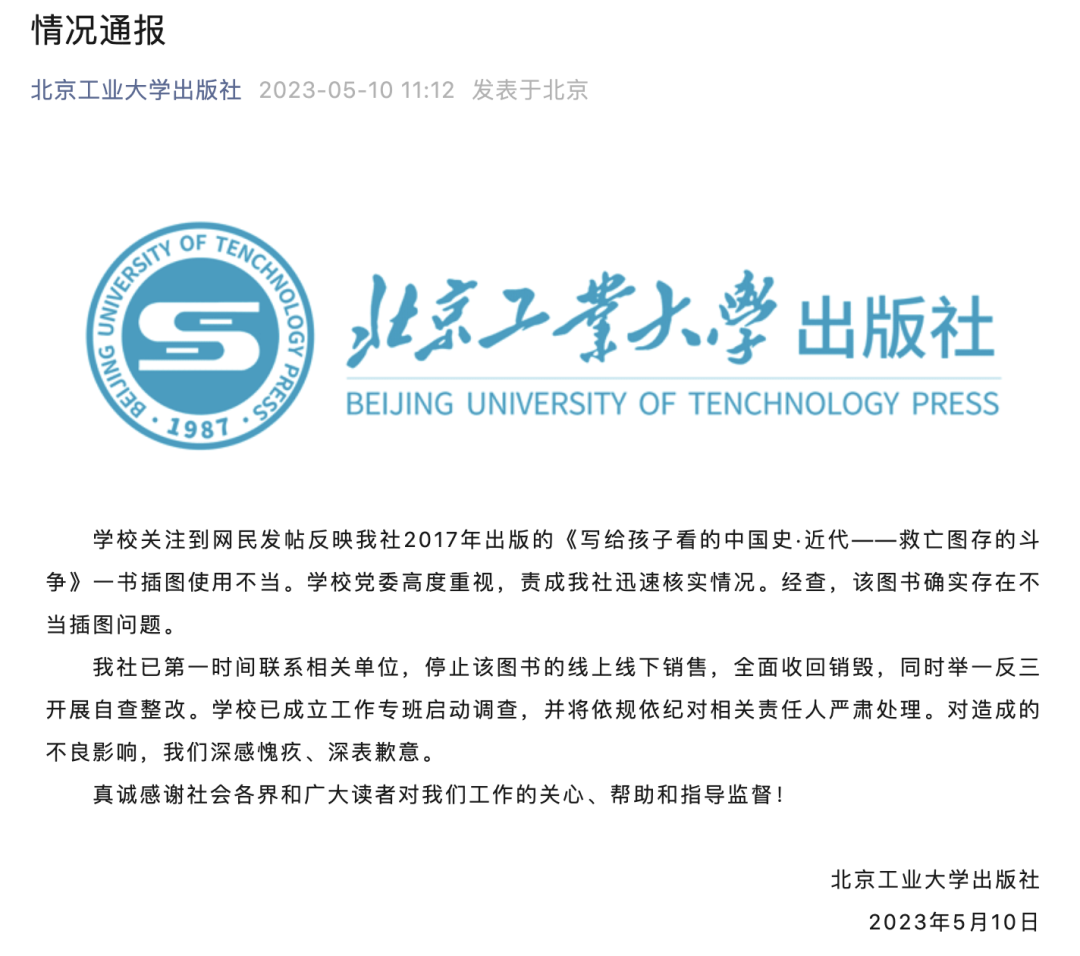 5月10日,北京工业大学出版社发布情况通报称,该图书确实存在不当插图问题。已第一时间联系相关单位停止销售,全面收回销毁。学校已成立工作专班启动调查,并将依规依纪对相关责任人严肃处理(此前报道:出版社致歉!停止销售、全面销毁)。