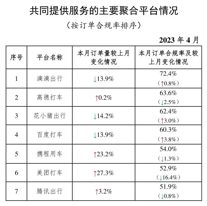 据了解,4月份,网约车监管信息交互系统共收到订单信息7.06亿单。在订单量前10名的平台中,按订单合规率(指驾驶员和车辆均获得许可的订单量占比)从高到低的分别是如祺出行、享道出行、T3出行、携华出行、万顺叫车、曹操出行、阳光出行、滴滴出行、美团打车、花小猪出行。本月订单合规率增长前3名的依次是阳光出行、T3出行、花小猪出行。其中,面向乘客、与网约车平台公司共同提供服务的平台(俗称“聚合平台”)完成1.96亿单,按订单合规率由高到低的聚合平台分别是滴滴出行、高德打车、花小猪出行、百度打车、携程用车、美团打车、腾讯出行。