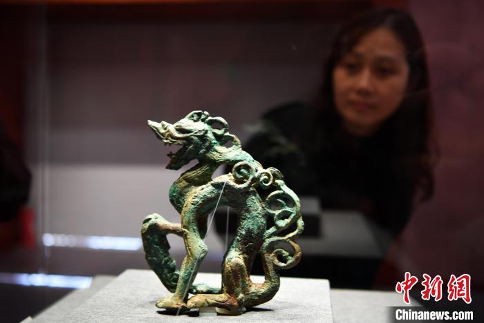 图为张家口市崇礼区太子城遗址展厅西半部的文物实物展示区,市民观赏铜坐龙。 翟羽佳 摄