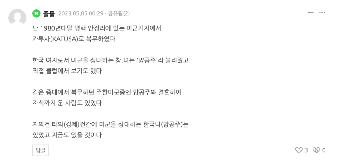 在韩联社网站相关报道的评论区内,一名自称上世纪80年代在驻韩美军附编韩军服役过的网友留言道:“我曾在美军基地俱乐部中亲眼见过这些所谓的‘洋公主’,也就是为美军服务的韩国性工作者。”