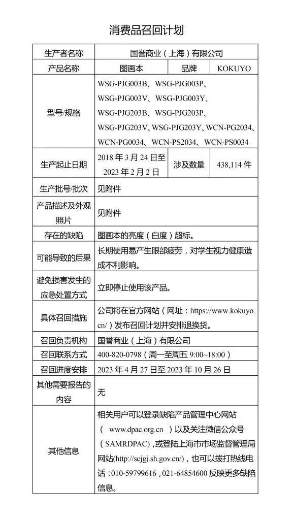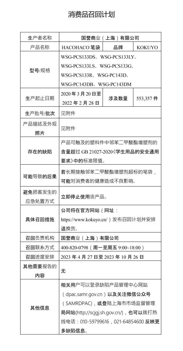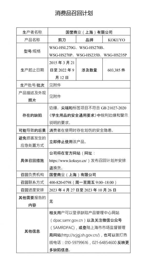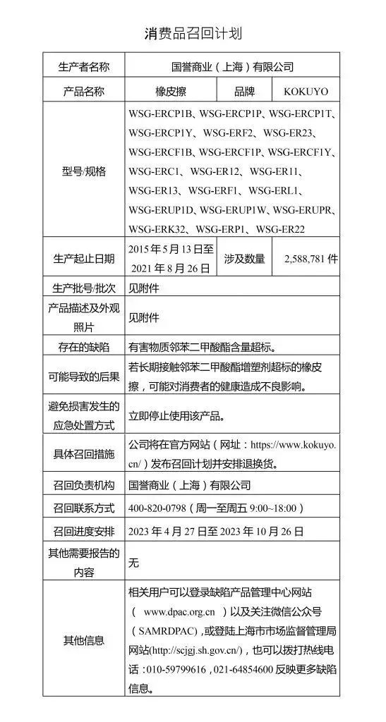 4月27日,上海市场监管发文称,国誉商业(上海)有限公司自2023年4月27日至2023年10月26日召回多种学生用品,涉及橡皮擦、剪刀、图画本、笔袋等。