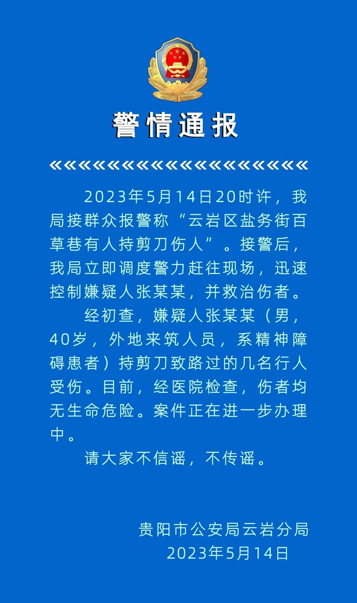 5月14日深夜,贵阳市公安局云岩分局发布警情通报:14日20时许,该局接群众报警称“云岩区盐务街百草巷有人持剪刀伤人”。接警后,该局立即调度警力赶往现场,迅速控制嫌疑人张某某,并救治伤者。经初查,嫌疑人张某某(男,40岁,外地来筑人员)持剪刀致路过的几名行人受伤。目前,经医院检查,伤者均无生命危险。案件正在进一步办理中。