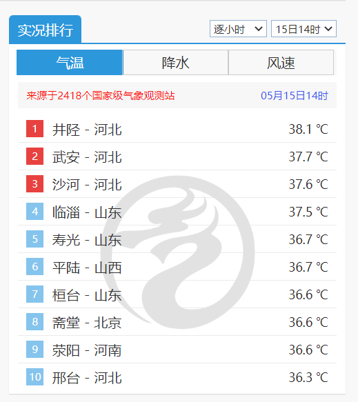 今年北方首轮高温天气来袭!截至5月15日14时,全国气温实况排行榜(TOP10)已没有36℃以下的身影,河北井陉以38.1℃位居榜首,北京的斋堂也有36.6℃。