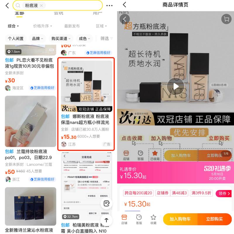 从“职业卖家”手中赚钱也越来越成为闲鱼商业化的重要部分。在帮助职业卖家打通淘宝和闲鱼后,第一财经发现,如今在闲鱼平台搜索商品时很容易就会进入卖家的“淘宝界面”。用户只要点击下方带有“广告”标识的链接,就会直接跳转到该商户的淘宝店铺产品下单页面。混入二手商品中的“淘宝广告”,为商家带来的引流和交易链路缩短效果必然更为可观,也在为闲鱼带来广告收入的不断增长。