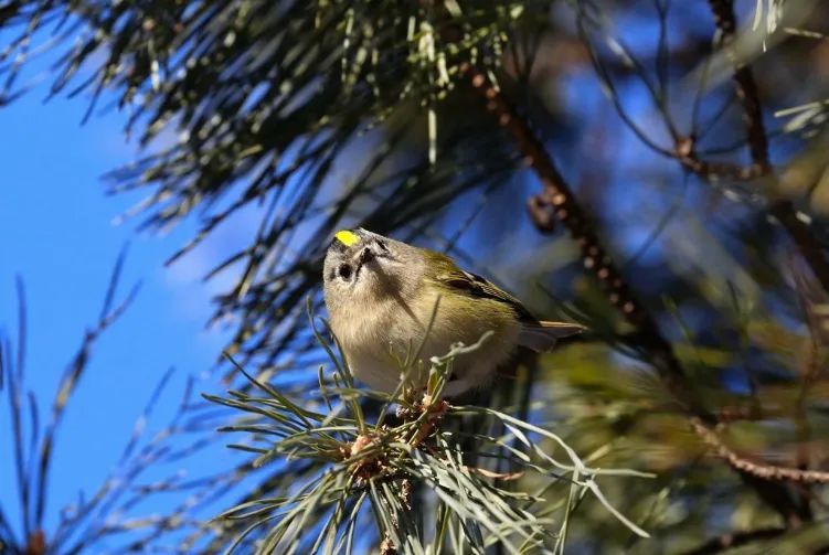见过这种头戴“皇冠”的小鸟吗?实际上这簇黄羽更像是一朵菊花,所以它有一个特别好听的名字——“戴菊”。每年4月前后,它们在这里现身,淡绿色的身体穿梭于针叶间,同时发出一种细小的鸣叫,可能是在说:“看我漂不漂亮?”