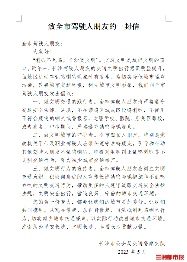 长沙交警发布《致全市驾驶人朋友的一封信》,“喇叭不乱鸣,长沙更文明”,倡议全市驾驶人严格遵守禁鸣降噪规定,积极劝阻和纠正乱鸣喇叭等不文明交通行为。