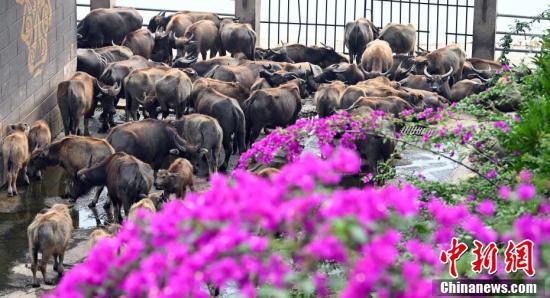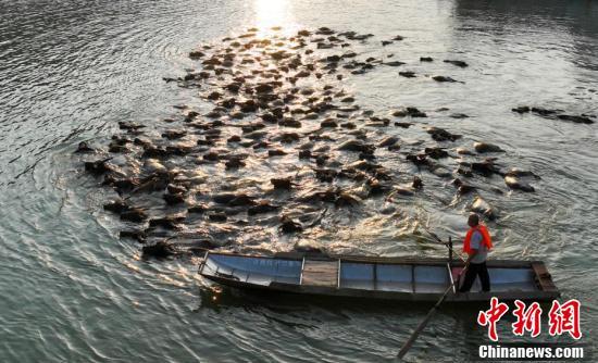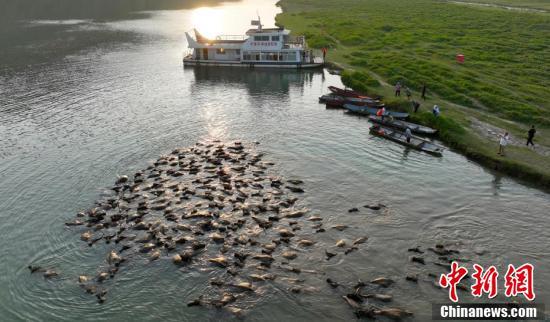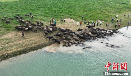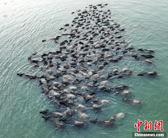 四川蓬安上演“百牛渡江”壮观景象