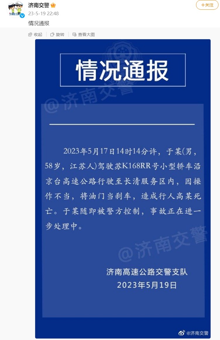 2023年5月17日14时14分许,于某(男,58岁,江苏人)驾驶苏K168RR号小型轿车沿京台高速公路行驶至长清服务区内,因操作不当,将油门当刹车,造成行人高某死亡。于某随即被警方控制,事故正在进一步处理中。
