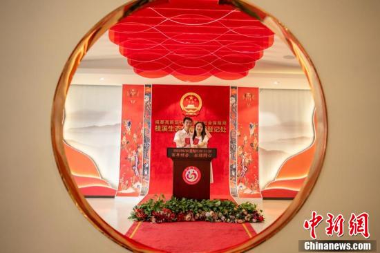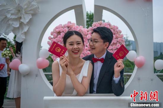5月20日,四川省成都市高新区桂溪生态公园婚姻登记处里外挤满了办理结婚登记的新人,现场一派繁忙景象。图为一对领取结婚证后的新人合影留下幸福时刻。