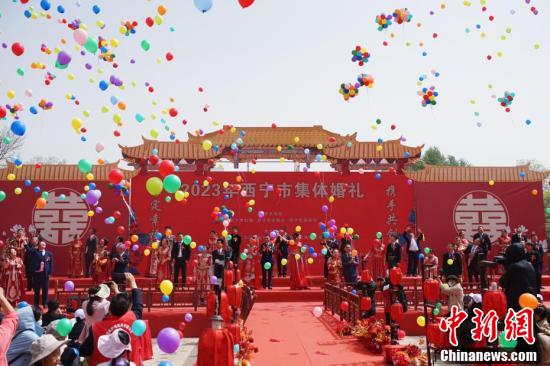 5月20日,西宁市举行“缘定幸福西宁·携手共创未来”集体婚礼。23对新人牵手入场,在亲朋好友的见证下,举行传统中式婚礼。图为西宁市23对新人喜结连理。