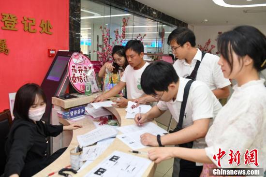 5月20日,众多新人选择这一天来到长沙市天心区民政局婚姻登记中心领取结婚证。图为新人扎堆领证。