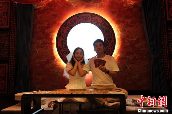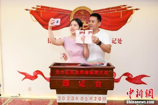 5月20日,因与“我爱你”谐音,许多新人都选择在这一天登记结婚。据了解,西安市未央区民政局的婚姻颁证大厅当天仅线上预约的新人就有360多对。图为新人拍照留念。