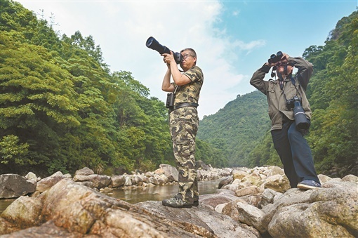 5月19日,“鸟博士”陈军(左)和技术人员陈德胜在自然保护区监测鸟类等野生动物。