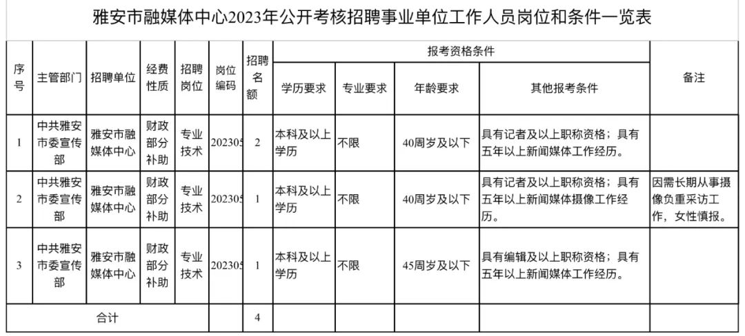 本次公开考核招聘事业单位工作人员共计4名,具体岗位及报考资格条件详见《雅安市融媒体中心公开考核招聘事业单位工作人员岗位和条件一览表》,凡符合岗位报考条件人员均可报名。报考人员须在报名前取得岗位要求的有关证书。未在规定时间内取得有关证书的,将取消进入下一招聘环节资格或聘用资格。