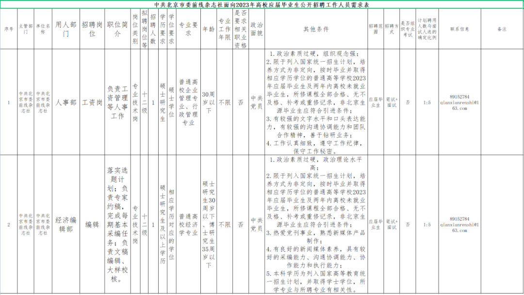 1. 中共北京市委前线杂志社面向2023年高校应届毕业生公开招聘工作人员需求表