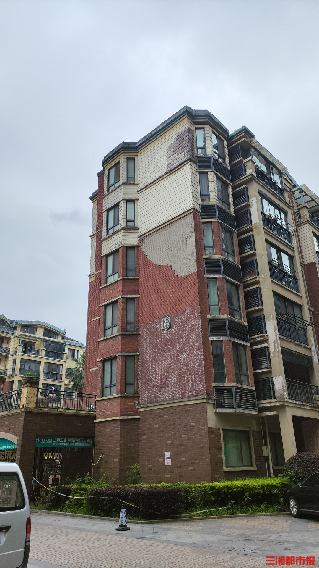 (5月23日,长沙市望城区珠江东方明珠小区内,部分楼栋外墙脱落。)