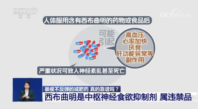 但是,根据一项长达6年的临床试验显示,西布曲明副作用很大,轻则口渴、心慌、失眠,重则产生神经损伤和精神性疾病,由此导致的心脑血管疾患甚至死亡风险明显增加,减肥治疗带来的风险明显大于临床获益。2010年,国家相关部门停止西布曲明制剂和原料药在我国的生产、销售和使用。