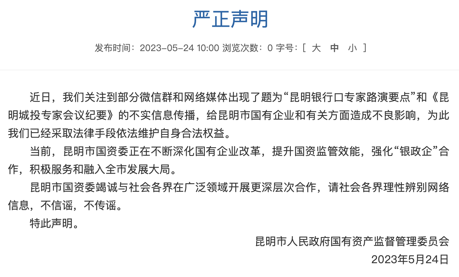 5月24日上午,昆明市人民政府国有资产监督管理委员会发布声明称,近日部分微信群和网络媒体出现了题为“昆明银行口专家路演要点”和《昆明城投专家会议纪要》的不实信息传播,给昆明市国有企业和有关方面造成不良影响,为此已经采取法律手段依法维护自身合法权益。