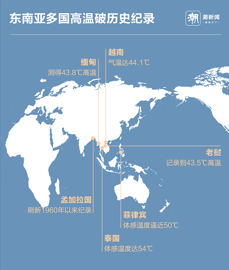 在亚洲,多国正经历着历史上罕见的高温天气,气温突破或追平历史记录。东南亚大部分国家和地区气温就突破40℃,接连刷新了历史同期最高气温纪录。