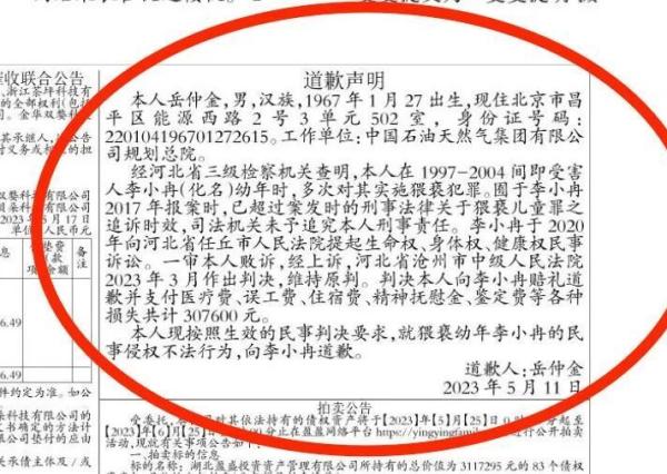 5月17日,在一份社会关注度并不高的行业报纸——《中国新闻》报的A13版的分类广告里,除了发票遗失公告、拍卖公告之外,还有这么一块豆腐干大小的道歉声明,讲述的案件是中国石油天然气集团有限公司规划总院的岳仲金,在李小冉5岁到12岁期间(1997年至2004年)对其实施的长期猥亵乃至性侵害,性侵害导致李小冉严重精神抑郁,被认定为限制民事行为能力人。