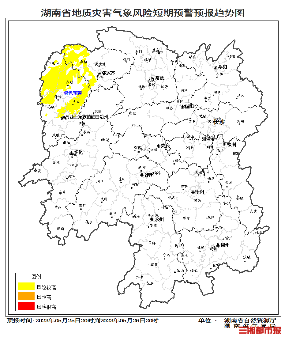 同时,根据地质灾害成灾规律和孕灾条件,结合5月25日短期气象预报情况,省自然资源厅与省气象局联合会商得出如下结论:自5月25日20:00至26日20:00,受降雨影响,湘西北部分区域发生突发性地质灾害风险较高(黄色预警)。