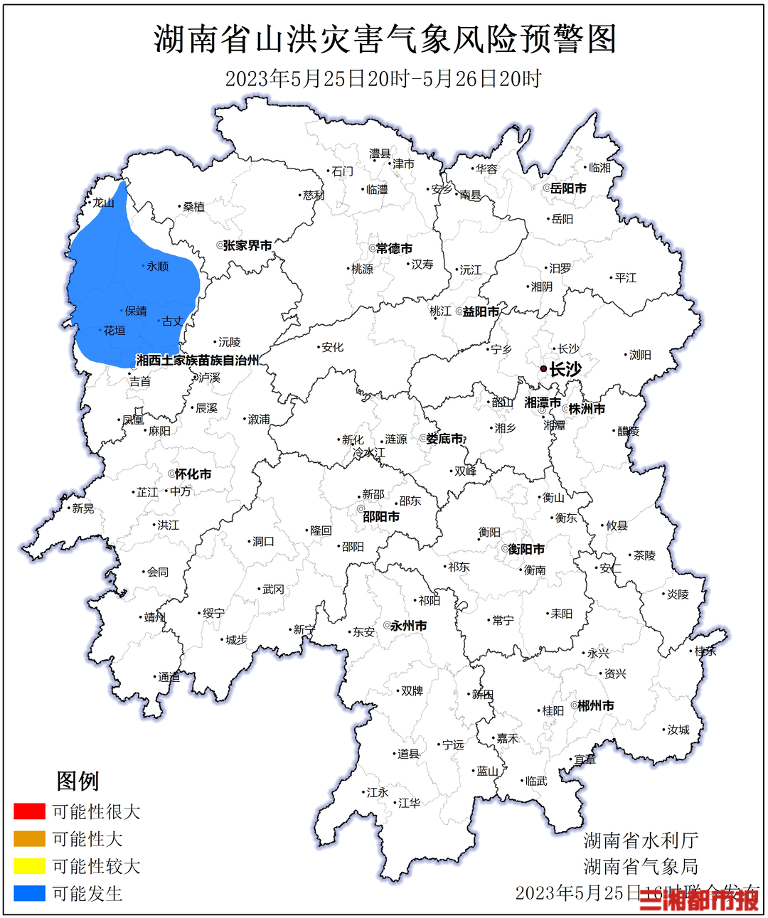 此外,根据湖南省气象台5月25日短期气象预报情况,湖南省水利厅与湖南省气象局联合会商得出如下结论:自5月25日 20:00至26日 20:00,受降雨影响,其中,湘西自治州等局地可能发生山洪灾害(蓝色预警)。